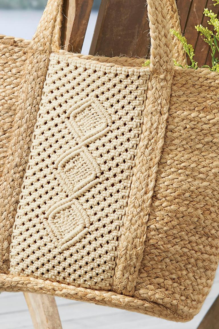 Organic artistry with a delicate touch. This open-top tote features the natural texture of jute with a diamond-patterned macramé inset. One inner slip pocket, 5″ x 8″. About 17″ x 12″, with 23″ strap.
